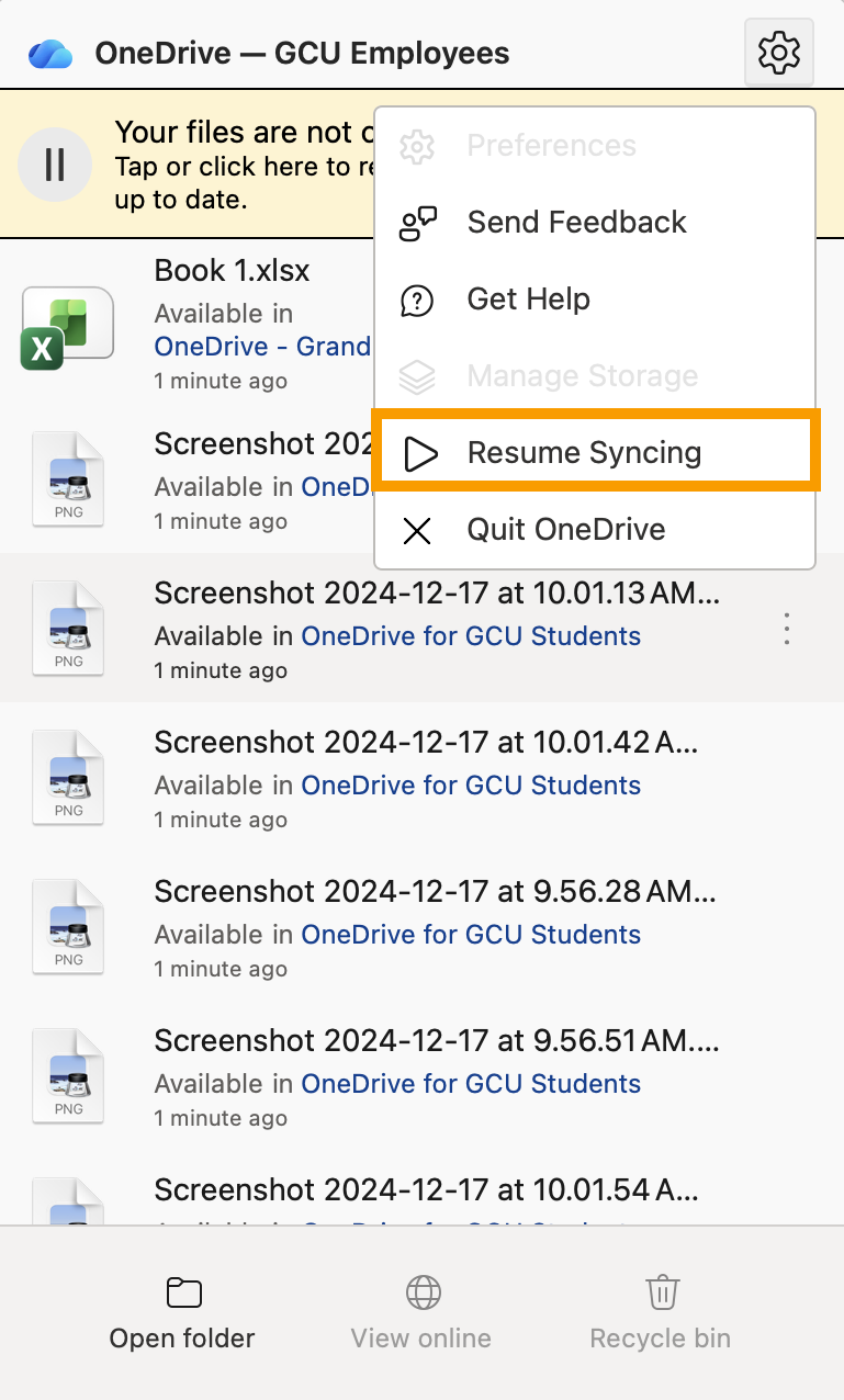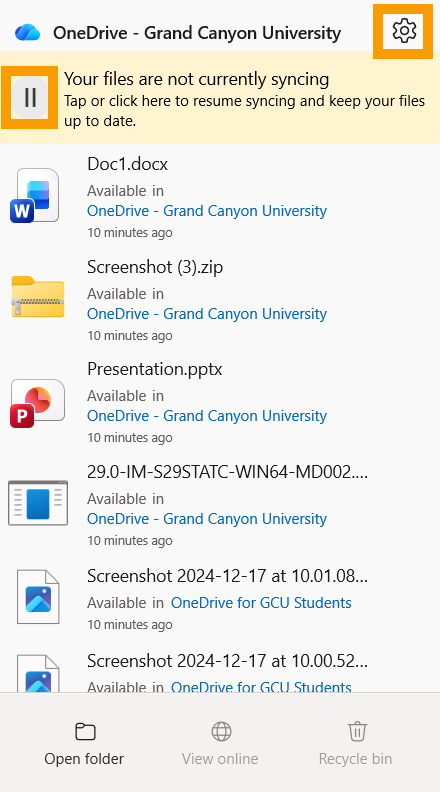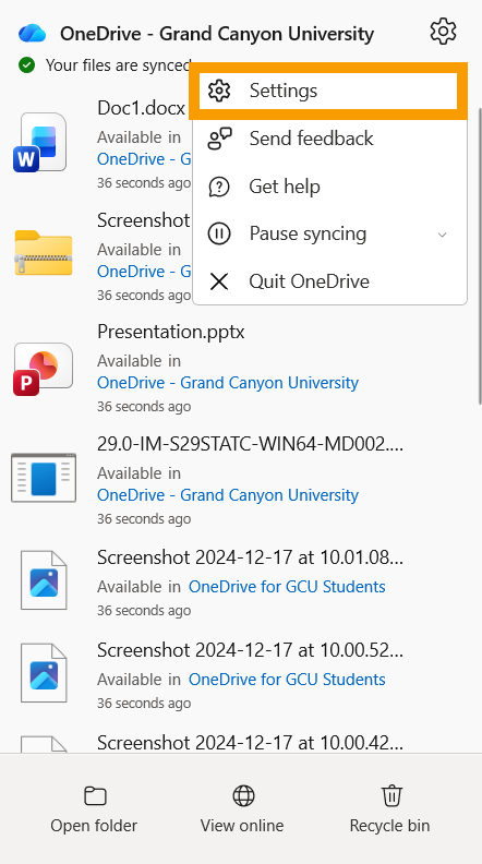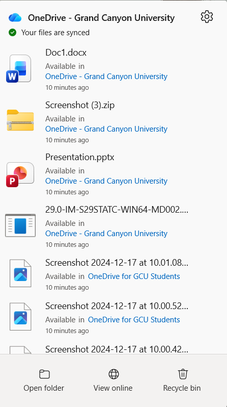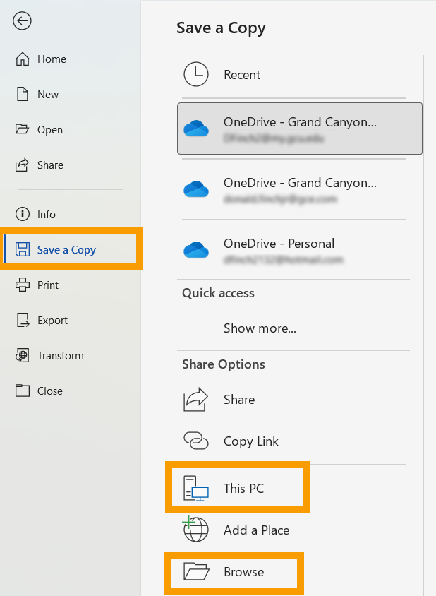 Tech Support’s scope of service for Microsoft 365 only includes the steps listed in this article. For more assistance with Microsoft 365, visit Microsoft’s support website at support.office.com.Please click on one of the Microsoft Application icons below: Microsoft Word Microsoft PowerPoint Microsoft OneDrive Microsoft Teams Expand/Collapse All Windows How to add Headers and Footers Your assignments may require that you add a header or footer to your Microsoft Word file. You can add them by double-clicking near the top or bottom of your paper, depending on which type you are trying to add. You can also add a header or footer by selecting the Insert tab and choosing the respective type. For more details on editing the style of the header or footer, check out this article from Microsoft. If you need some help on what to put in the header or footer, take a look at The Writing Center, located in the Student Success Center. In The Writing Center, you can find MLA, APA, and GCU style guides, as well as templates and other helpful writing websites. Recovering Unsaved Documents Start by opening Microsoft Word. On the left-hand side, click Open. On the bottom section of the Open tab, click Recover Unsaved Documents. You will then be presented with a list of your unsaved documents. Notice: Not all your content may have been saved when recovering your document. Recovering Saved Documents The following steps will help you recover a Word document that was saved onto your computer before but are unable to locate after saving. In Microsoft Word, click Options in the bottom left-hand corner. Once in the Options tab, select Save from the left-hand column. Under the Save documents section, copy the AutoRecover File Location. Open your File Explorer (the manila folder icon on your taskbar) and paste the location into the top bar. Then, click enter. Open the folder matching the name of the original saved file. Next, open the .asd file by right-clicking over the file and selecting Open with. From the pop-up window, select Word. Your recovered document will now open! Notice: There is a chance that your file may not be recovered. How to Save a Document Following are the steps in saving your document: Navigate to the File option in the upper left corner of your screen. Select Save As from the main menu on the left-hand side panel. To save your document in an existing folder, click Browse under Add a Place.Navigate to the desired folder. Enter your file name and select the “Word Document” format.Once done, click Save. If you are saving to OneDrive, choose your organization’s OneDrive folder. For GCU accounts, it’s recommended to save to OneDrive - Grand Canyon University storage. Enter your desired file name, select the “Word Document (*.docx)” format, and click Save. Showing Comments You may receive a document that has comments on it, but the comments are not showing. Follow the proceeding steps to show these comments: While your Word document is open, click on the Review tab. In the Comments section, select Show Comments. If done correctly, comments will appear on the right-hand side of your Word document. Opening Protected Documents You may download a document from your course that won’t allow you to make changes to the document. The following steps will walk through allowing a document to open when you receive the error “Word is unable to open this document it may be protected”. NOTE Before completing these steps, please know that there are potential risks of security threats when downloading files from the internet. You should always be careful of the files that you download from the internet and only download from trusted sources. Attention Technicians: If a customer encounters an error which requires them to complete these steps, you must explain the potential risks before continuing. With Word open, select Options from the bottom left-hand corner. Once in the Options, go to Trust Center. Then select Trust Center Settings. In the Trust Center, select Protected View. Then uncheck the three options in the center. Press OK and then try to open the Word document that you downloaded from your course. Enabling or Disabling Track Changes Turning on Track Changes gives you and anybody else accessing the document a way to make changes that are easy to spot. The changes are like suggestions that you can review, and then remove them or make them permanent. When Track Changes is on, Word will indicate there had been a change with a red bar on all lines that have changed. Clicking on the red bar will show the edits that have been made. Deletions are marked with a strikethrough, and additions are marked with an underline. Different authors' changes are indicated with different colors. To enable or disable Track Changes in your document, select Review from the toolbar at the top of the screen. Track Changes is located under the Tracking section. If it is on, the button will appear dark gray. If it is off, the button will match the color of the toolbar. NOTE Disabling Track Changes will not automatically accept all changes made with Track Changes on. To accept all changes, select the drop-down arrow under Accept in the Tracking section of the Review tab. Then, select Accept All Changes. Turning Off Dark Mode on Windows Windows computers allows users to turn on dark mode to help with working during the night. In Microsoft Word you may notice that your document will appear with a black page and white text. This means that Microsoft Word is using the dark mode on your documents. To disable dark mode in Word, click on View at the top and then click the Switch Modes icon at the top. To enable dark mode in Word, you will first need to turn on Dark mode in the Word canvas, select File > Account > Office Theme > Black. Word Similarity Report Generator Through the online version of Microsoft Word, users are able to generate a similarity score similar to what LopesWrite provides. This score is not an official