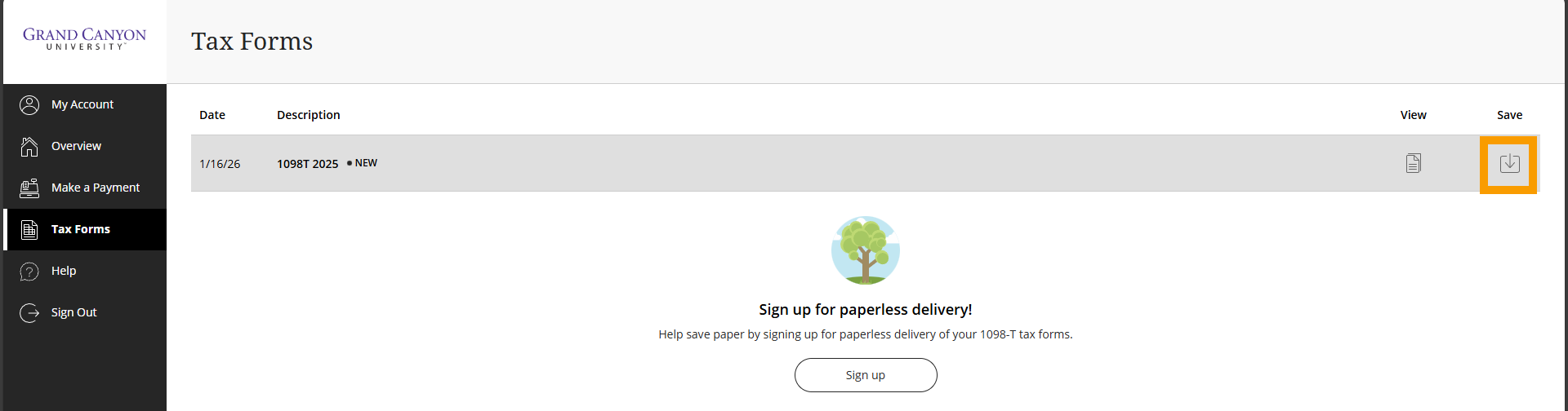 What is a 1098-T?The 1098-T is an IRS form that students may use when filing taxes. It is not a bill. The activity reported on the 1098-T refers to transactions for tuition charges or adjustments, scholarships, and grants that posted to your student account between Jan. 1 and Dec. 31. The form does not reflect payments or loan disbursements. A student that has not attended class in the calendar year reflected on the 1098-T may receive a 1098-T if they had adjustments to the prior year's tuition, scholarships or grants.When will I receive it?All tax documents will be available and mailed by Jan. 31. Prior to 2025, GCU uses a third party (ECSI) to produce and mail all IRS 1098-T forms. It is sent to all students who had qualified tuition, other related educational expenses, scholarships or grants applied to their account during the previous tax year. The form is mailed to the address listed on the student's official record on their GCU account. After 2025, students can find the form through their GCU Student Portal. NOTE GCU does not offer tax advice. All tax related inquiries should be directed to a qualified tax professional or to the IRS Taxpayer Assistance line at 800-829-1040.Where can I find 1098-T information online?Expand/Collapse All Prior 2025 Students may view and print their 1098-T form online directly from the ECSI website for tax years before 2025. To get access to their 1098-T form online, they will need to start by navigating to the following link: https://heartland.ecsi.net/index.main.html#/access/signIn Students will need to create an account on the ECSI website and contact Heartland’s online support team at (866)-428-1098 for further assistance with connecting their account and accessing the 1098-T form online. NOTE For any frequently asked questions or concerns regarding 1098-T tax forms, please visit https://heartland.ecsi.net/index.main.html#/access/FAQtaxDocuments and select “Click here to Learn About Your 1098-T Tax Document.” After 2025 Starting 2026, students can find the 1098-T form for tax years 2025 and beyond through the GCU Student Portal. To access the 1098-T form, follow the steps below. Start by logging into the GCU Portal. Once logged in, click the Helpful Links app. Click on the Tax Forms link. This will take you to a third-party website called CashNet. Once the page has loaded, select Tax Forms. NOTE If you try to navigate to the account or make a payment options, you may see a message that that feature is not available now. The link for the Tax Forms should only be used to get the tax form. You will then see your tax form that is available to download. Press Save to download a PDF copy or press View to view the form online. Why does it say there are no tax forms available? If you do not see a tax form available, there might be two reasons why. The first is that the forms for the 2025 calendar year have not been generated yet. The forms should be available no later than January 31st, please check back later to see if the form gets generated. The second reason is because Grand Canyon University has not generated a 1098-T form for you. If this is the reason why you are not seeing any forms, you will receive the following error message. “Grand Canyon University has not generated a 1098-T form for you. Common reasons for this to occur are a) you did not make any payments during the year or b) Grand Canyon University does not have your social security number on file. If you feel that this is an error, please contact your Student Services Counselor. For further information regarding your 1098-T form, please visit the Tuition & Financial Aid page on the GCU website. Under the Other Financial Resources you will see a link titled 1098-T Tax Information for Students.” If you have any questions, please reach out to your Student Services Counselor for assistance. If you are looking for the 1098-T form from a year prior to 2025, please see the Prior 2025 section above. January 27, 2026 20:51 Updated Related articles Making a Payment in the GCU Portal for Online Students Document Management Forms Third-Party Contact Information Frequently Asked Questions Making a Payment Online for Campus Students